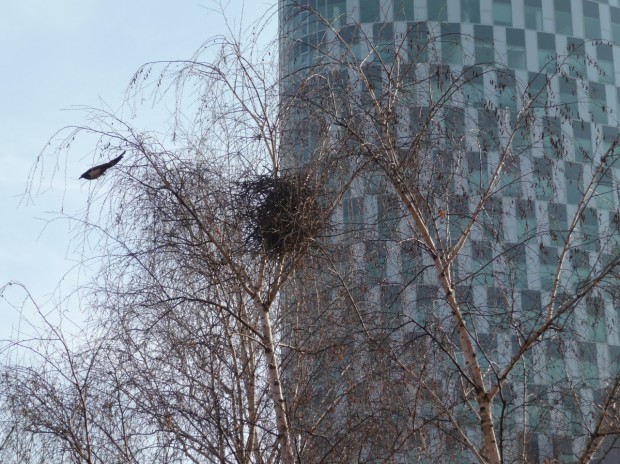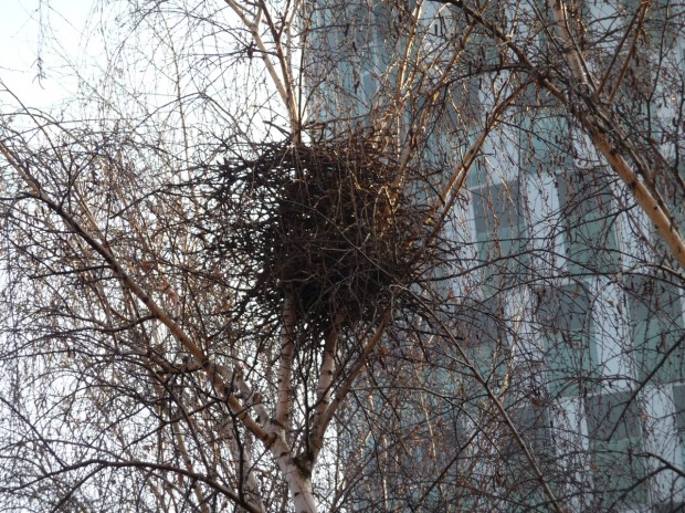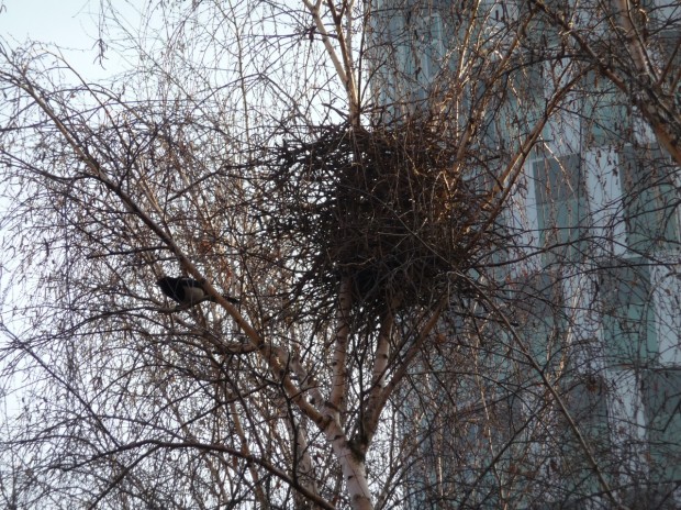 När jag vädrar och skakar sängkläderna ifrån mitt sovrumsfönster om morgnarna ser jag rakt in i ett litet hus uppe i björken mittemot, ett kråkslott för skator, kunde man kalla det. Bakom det ser man vad människan hittat på i just denna tid. Skatboet har nog samma konstruktion och stil som i alla skattider.
