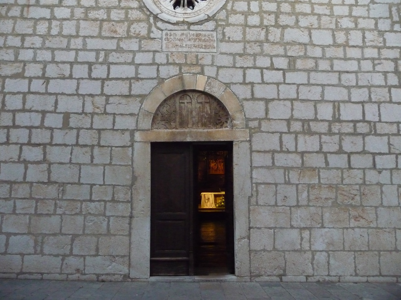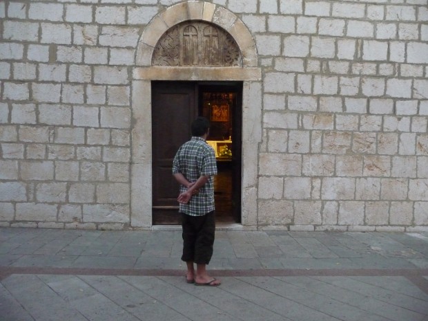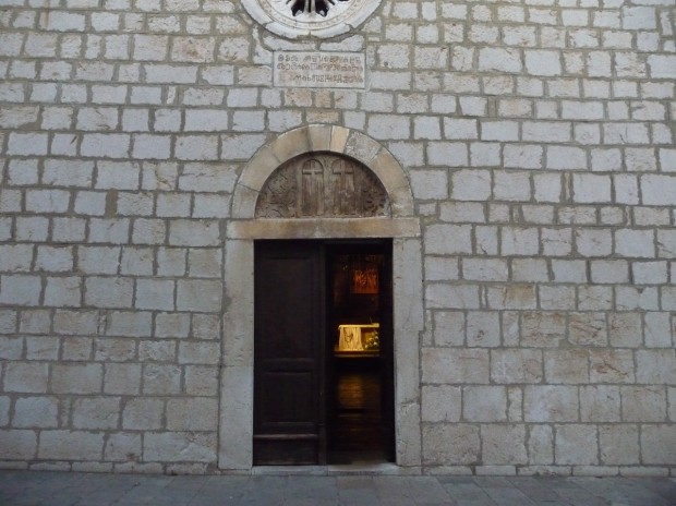 Genom den uppslagna porthalvan under det glagolitiska budskapet kunde man höra ljud av bön och förkunnelse och något musikaliskt fragment och ett hemlighetsfullt dunkelt ljus trängde också ut i oktobersommarkvällen.