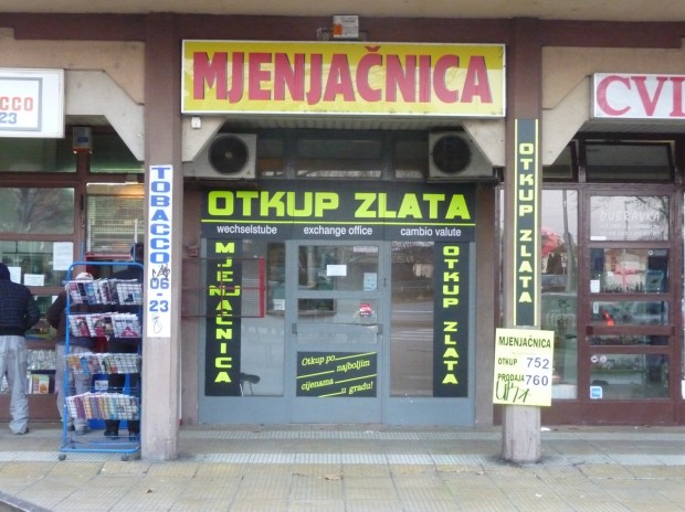 Jag vet inte om jag inbillar mig eller överdriver, men det verkar som om det på ganska kort tid dykt upp fler och fler ”affärer” som köper guld här i stan. När jag flyttade hit var i alla fall den här ”shopen” bara ett växlingskontor, en mjenjačnica.