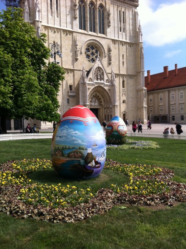 Framför katedralen står de tre påskäggen uppställda i gräset som de brukar (fast en gång tror jag de var fyra) – en skön blandning av glad kitsch, jugoslavisk (förlåt, kroatisk) naivism och blomsterfröjd. Missa inte paraplyet från Šestine på det ena äggets topp!
