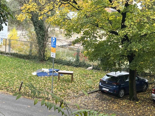 Jag sa till Miki att jag måste ut på egen hand och så gick jag ner för trappan och träffade då min granne – den grannen som jag inte vet namnet på – och jag berättade saken för honom. Vi gick över gatan tillsammans. Där stod redan Greys matte med mobilen i högsta hugg och två män en bit bort verkade också försöka kontakta djurhjälpen. Min granne försökte få upp låset till grinden men misslyckades. Greys matte nådde Dumovec, djurskyddet, och de skulle komma, så jag gick upp till Miki igen. Då och då tittade jag ut genom fönstret och såg svanen vanka längs spjälorna. Det gick lite tid, tio minuter kanske, utan att jag tittade ut och när jag sedan kom fram till fönstret kunde jag inte se någon svan. Snabbt tog jag på mig skorna, sa till Miki att vänta och så sprang jag nerför trappan och ut och över gatan och fram till stängslet. Och där – hela svanfamiljen var samlad på vattnet, ja, en av föräldrarna var ivrigt upptagen med fiske och visade bara ändan.
